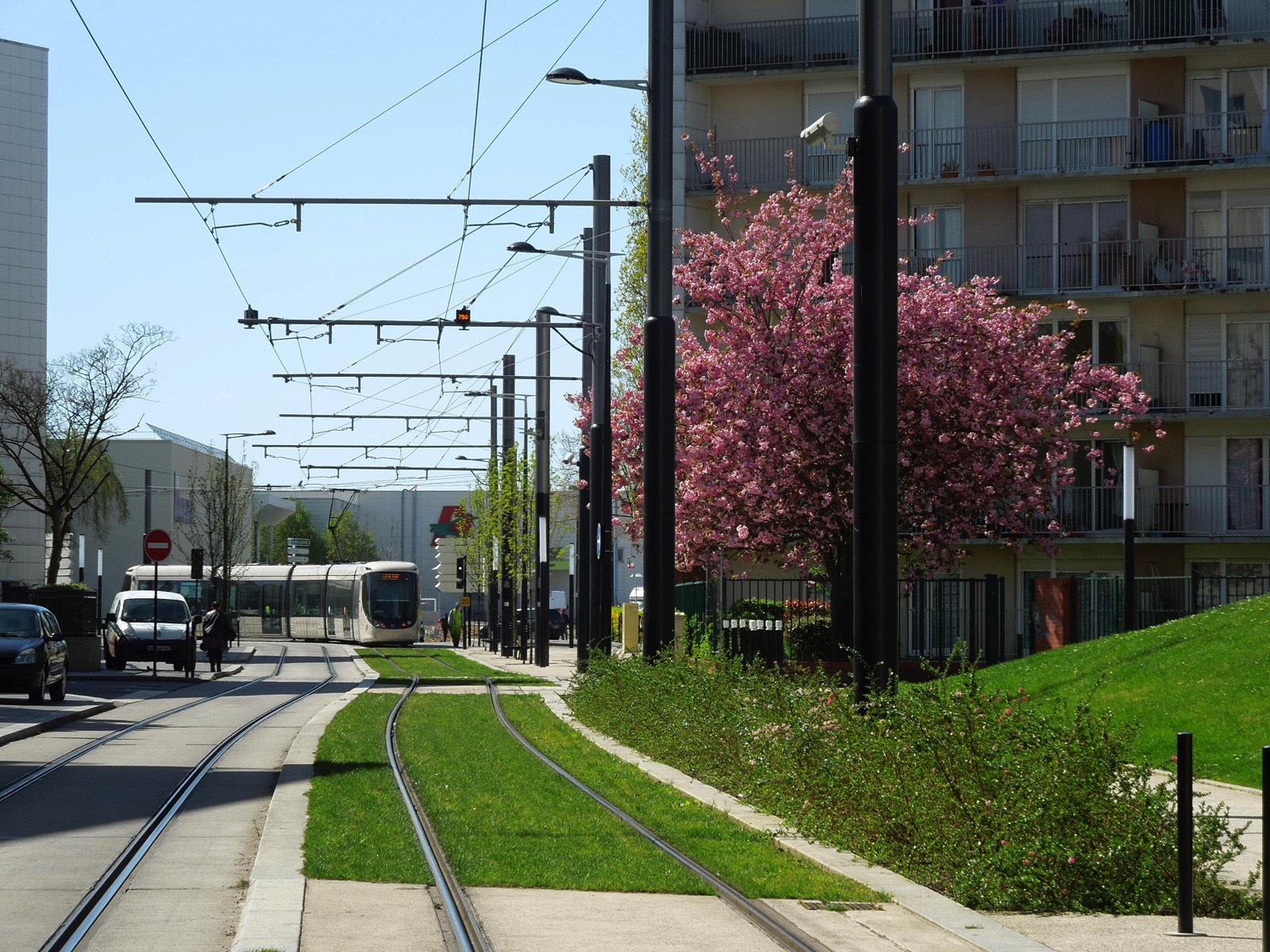Le parti pris est d’ancrer le projet dans son contexte et ses dynamiques d’évolution. Dans la ville basse, les alignements d’arbres de grande hauteur soulignent le tramway et cadrent les perspectives urbaines. Dans la ville haute, le tramway inscrit un “fil végétal coloré” qui se nuance avec différentes essences d’arbres selon les séquences traversées. C’est au total plus de 1500 arbres d’alignement et cépées qui sont plantés dans une gamme très large (44 variétés différentes).